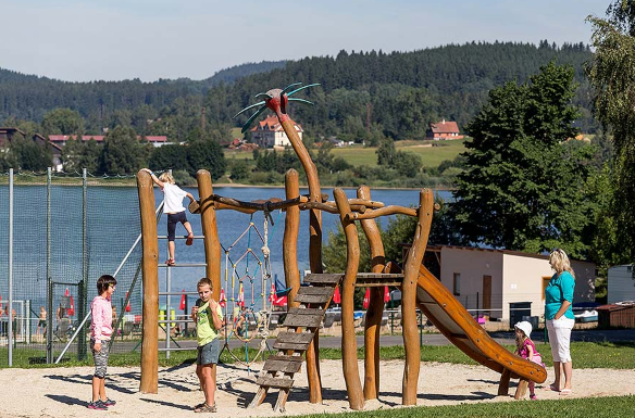 Milovníci vodních sportů a koupání jistě ocení neobyčejně výhodnou polohu hotelu Racek, od něhož je na písečnou pláž k vodě jen několik desítek metrů. Na hotelové pláži je možné zapůjčení loděk s elektromotorem, šlapadel a motorových aut (dovolená pro náročnou klientelu Tuzemsko). Nedaleko se nachází přístav osobní lodní dopravy. V sezóně se zde koná celá řada republikových i mezinárodních jachtařských závodů. Půjčovna windsurfingu, kol a stále populárnějších kite (včetně výuky) - 500 m od hotelu.  V nedaleké obci Hůrka lze zapůjčit katamarán (dovolená s výhledem Černá v Pošumaví).